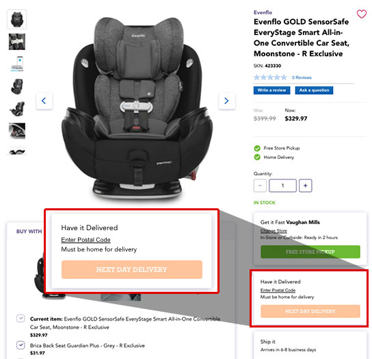 - Shop online as usual: you’ll see your delivery options on the right side of the product page. If the item is available for Same-Day Delivery, please enter your postal code in the box to confirm that your location is eligible.